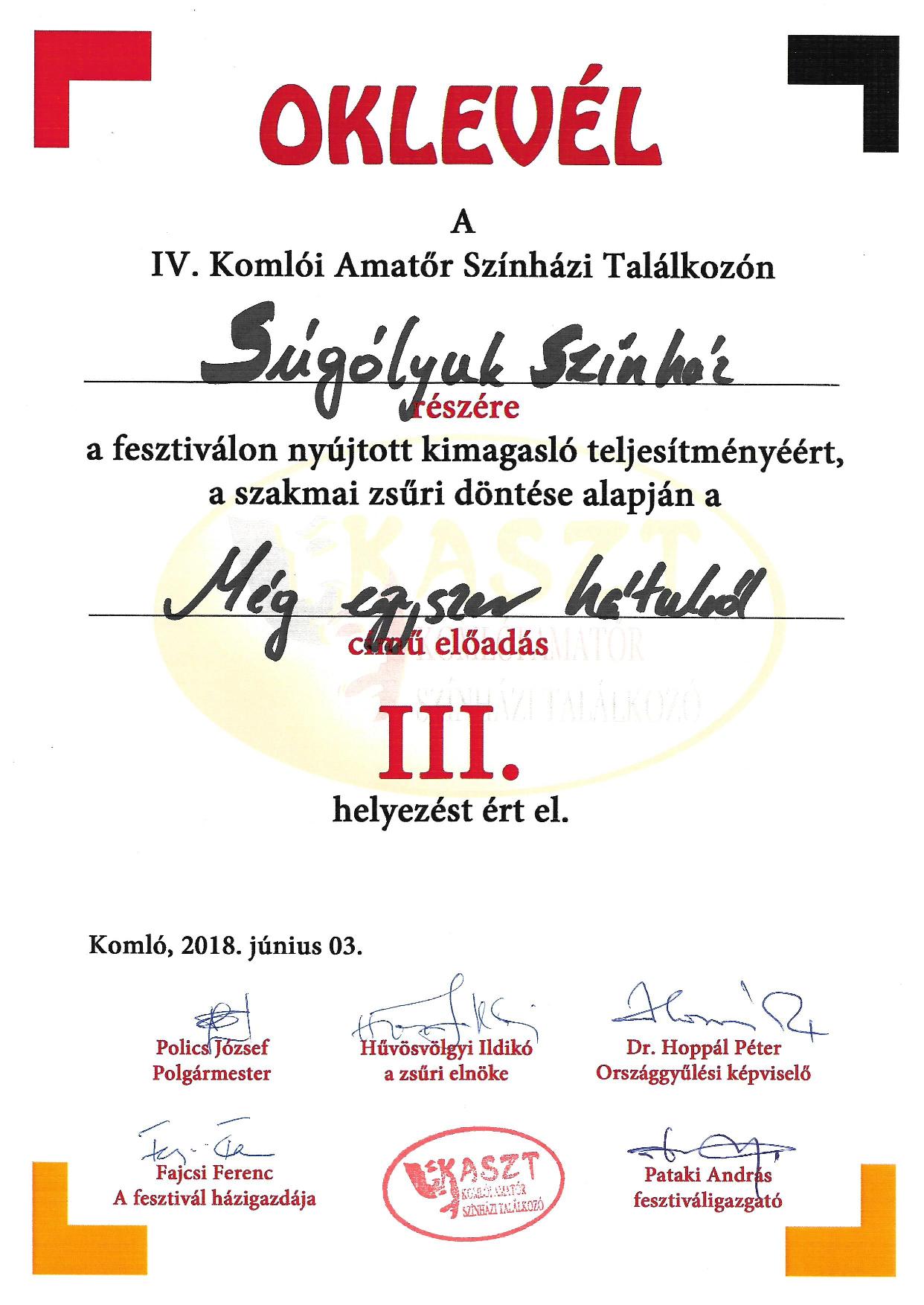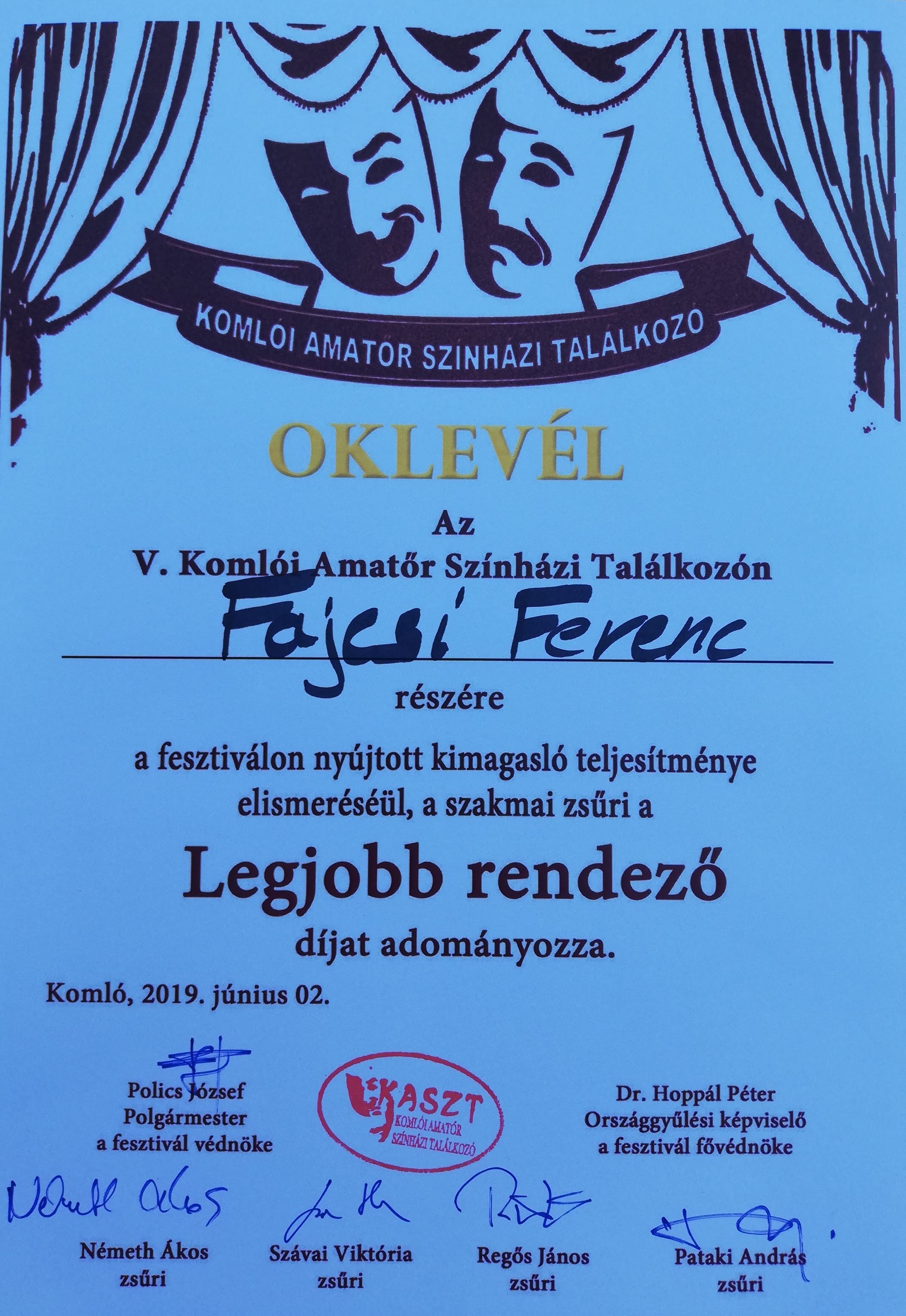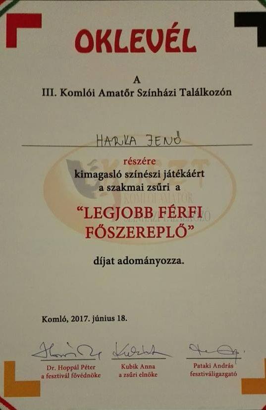 Ilyen eredmények mellett talán mégis arra a legbüszkébb a társulat, hogy a 2015-ben megrendezett I. Komlói Amatőr Színházi Találkozó házigazdája lehetett és ott különdíjként – a Magyar Szín-Játékos Szövetség által ARANY minősítéssel kitüntetett – Nádassy László – Rejtő Jenő: A jutalomjáték című bohózatával fellépési lehetőséget nyert a Soproni Petőfi Színházban, valamint a Nemzeti Színházban. A társulat sikere a II. KASZT-on (2016) tovább folytatódott: a Magyar Szín-Játékos Szövetség a Ray Cooney: Család ellen nincs orvosság című vígjátékát EZÜST minősítéssel jutalmazta. A III. KASZT-on (2017) a Magyar Szín-Játékos Szövetség a Neil Simon: Furcsa pár című vígjátékát ARANY minősítéssel díjazta, Harka Jenő pedig a LEGJOBB FÉRFI FŐSZEREPLŐ díját vehette át. A IV. KASZT-on (2018) előadott Michael Frayn: Még egyszer hátulról című vígjátékot a Magyar Szín-Játékos Szövetség ARANY minősítéssel díjazta. Az előadással a társulat a fesztiválon a 3. helyet szerezte meg. Az V. KASZT-on (2019) a társulat Francis Veber: Balfácánt vacsorára című vígjátékát mutatta be, melyet a Magyar Szín-Játékos Szövetség ARANY minősítéssel díjazott. Fajcsi Ferenc a LEGJOBB RENDEZŐnek járó díjat, Tóth Zsolt pedig SZÍNÉSZI KÜLÖNDÍJat vehetett át.